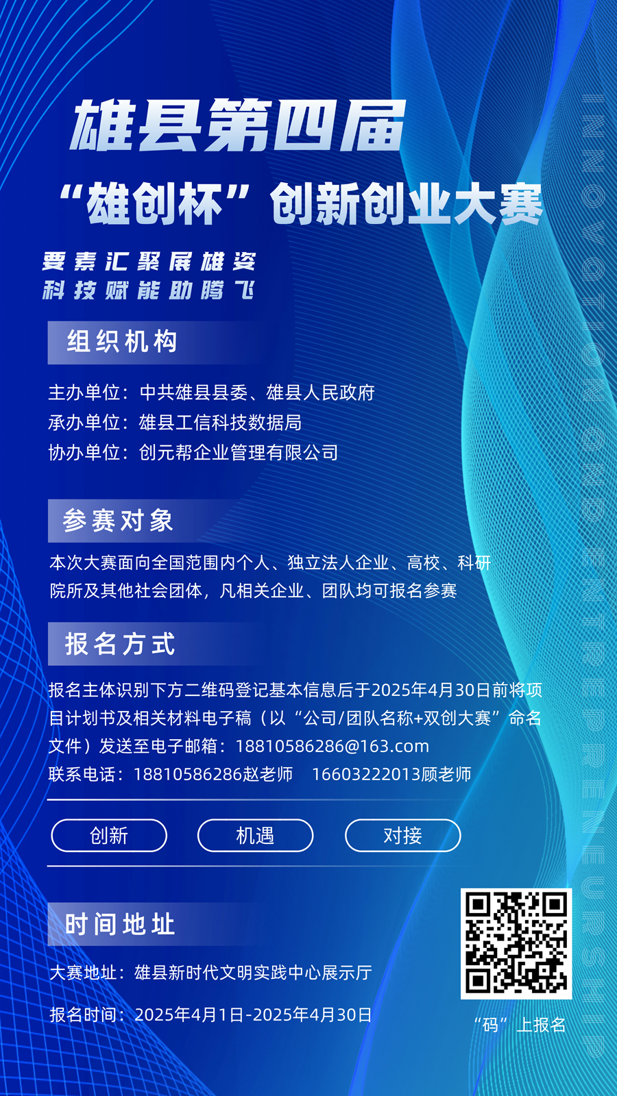 此次大赛以“要素汇聚展雄姿,科技赋能助腾飞”为主题,聚焦新材料和低空经济产业,征集新项目、新技术、新产品,助力雄县优势特色产业转型升级,加速培育新质生产力。