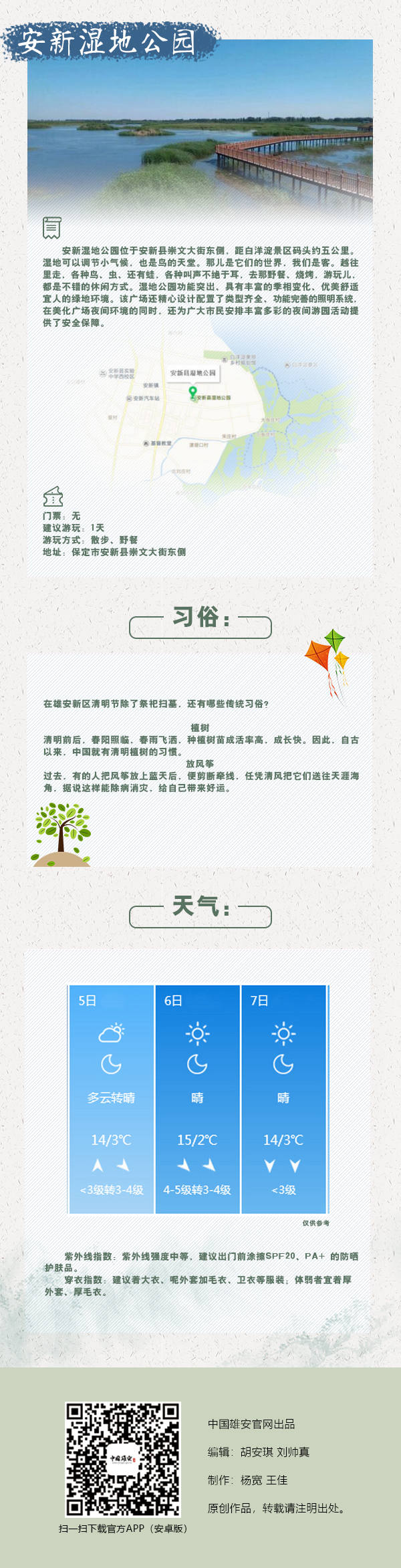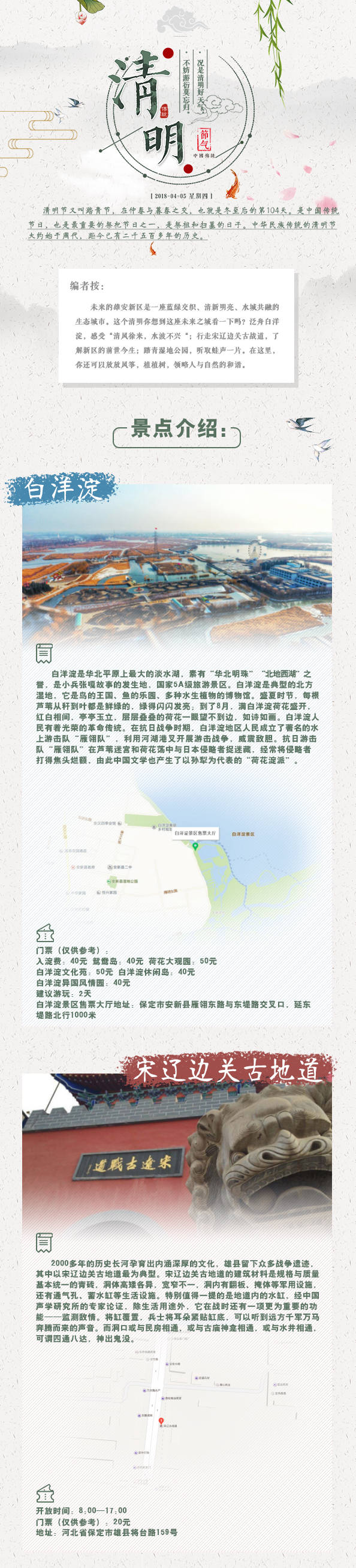 未来的雄安新区是一座蓝绿交织、清新明亮、水城共融的生态城市。这个清明你想到这座未来之城看一下吗?泛舟白洋淀,感受“清水徐来,水波不兴”;行走宋辽边关古战道,了解新区的前世今生;踏青湿地公园,听取蛙声一片。在这里,你还可以放放风筝,植植树,领略人与自然的和谐。