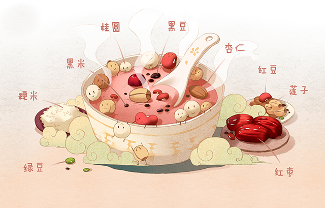 不同地区腊八粥的用料虽有不同,但基本上都包括大米、小米、糯米、高粱米、紫米、薏米等谷类,黄豆、红豆、绿豆、芸豆等豆类,红枣、花生、莲子、枸杞子、栗子、核桃仁、杏仁、桂圆、葡萄干、白果等干果。腊八粥不仅是时令美食,更是养生佳品,尤其适合在寒冷的天气里保养脾胃。