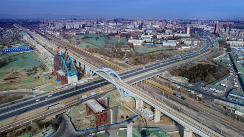 位于北京黄村的建设中的京雄城际铁路(2019年1月5日无人机拍摄)。