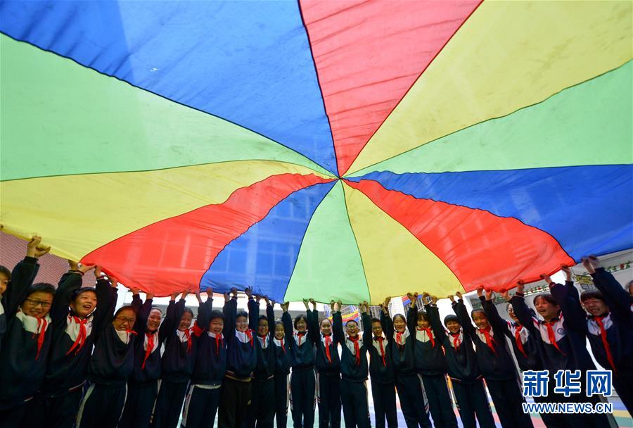 4月29日,邯郸市邯山区实验小学的学生在做“彩虹伞”体育游戏。2018年以来,为解决小学生四点半放学后无人看管的问题,河北省邯郸市邯山区实验小学成立“四点半课堂”。下午放学后,学校组织教师对学生进行课业及艺术、科学等方面的辅导,促进学生全面发展。“四点半课堂”为小学生提供了一个学习休闲的好去处,深受学生及家长欢迎。新华社记者 王晓 摄