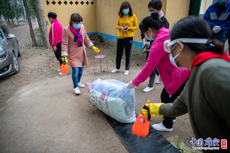 为了确保学生身体健康,板东中学对初三年级的317名学生全部实行寄宿制管理。5月5日上午,初三学生家长分时段到达学校,将行李送到校门口,由老师进行消毒,最后搬运至每个宿舍。图为板东中学的老师们对学生行李进行消毒。中国雄安官网记者马梦迪 摄