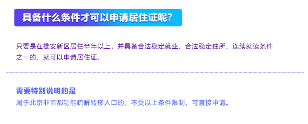 答:在雄安新区居住半年以上,并具备合法稳定就业、合法稳定住所、连续就读条件之一的;属于北京非首都功能疏解转移人口的,不受以上条件限制,可直接申请。