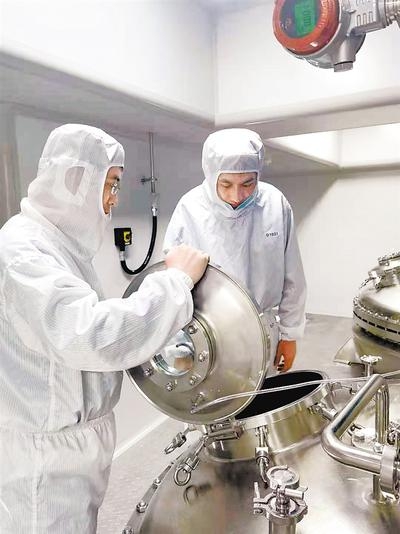 在北京·沧州渤海新区生物医药产业园,北京福元医药股份有限公司沧州分公司生产人员在车间洁净区生产产品。企业供图