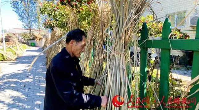 走在东淀头村,记者发现很多房屋前都摆放着成捆的蒲草。