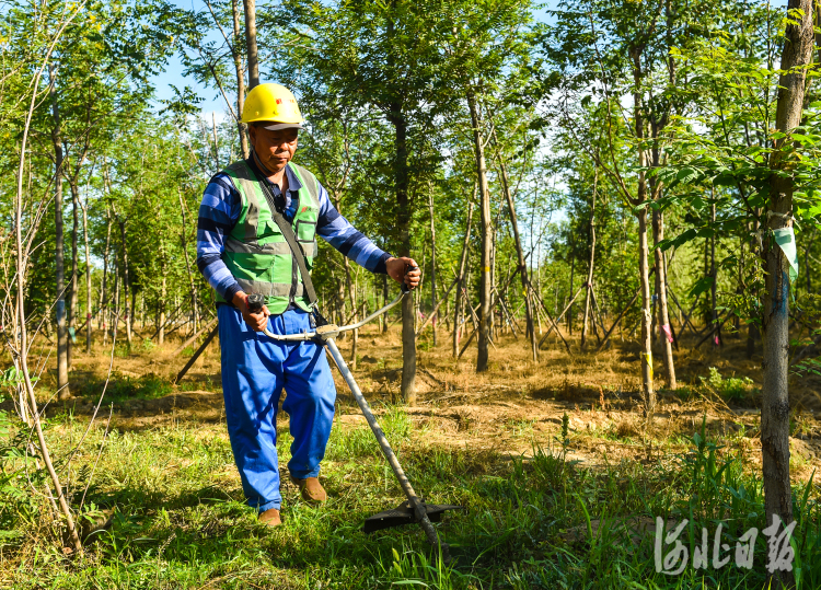 2021年6月19日,雄安新区千年秀林,护林员邸永华正在锄草。河北日报记者耿辉 摄