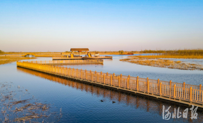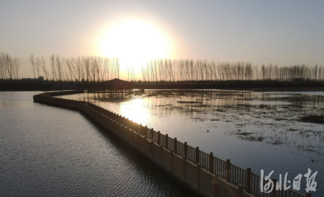 2022年3月26日,夕阳下的白洋淀新安北堤木栈道。河北日报记者赵海江 摄