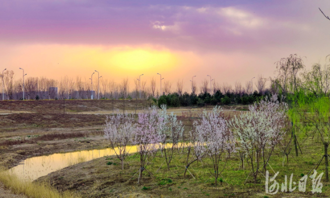 2022年3月26日,生态堤绿化中的桃花、杏花竞相绽放。河北日报记者赵海江 摄