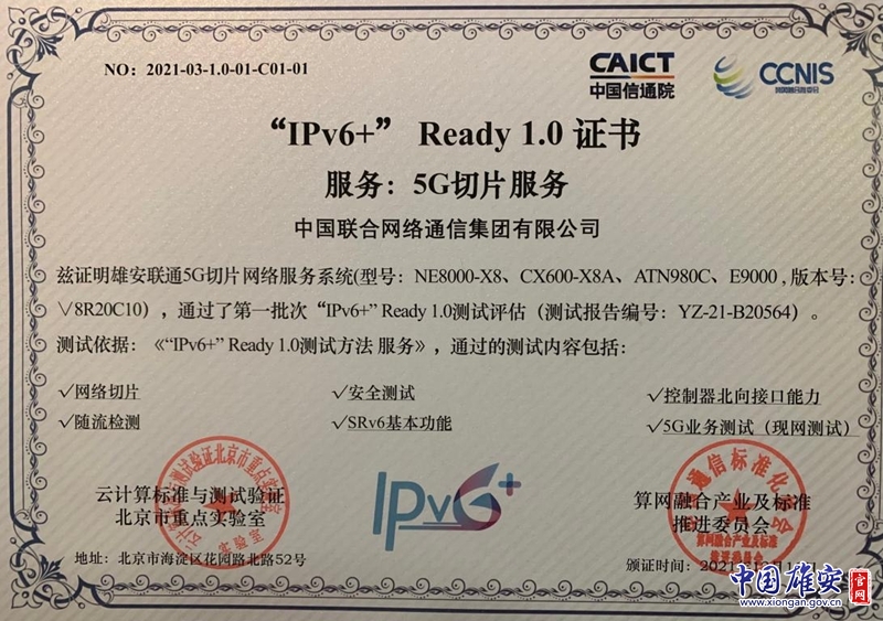 “IPv6+”Ready1.0证书。雄安联通供图