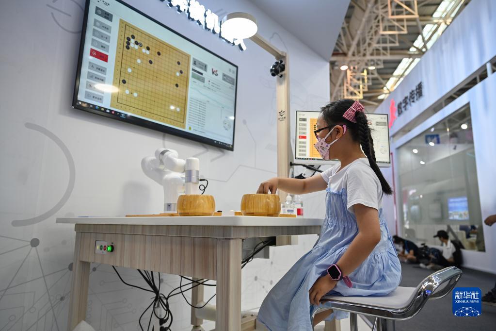 7月22日,小朋友在第五届数字中国建设成果展览会上和AI机器人下棋。新华社记者周义 摄