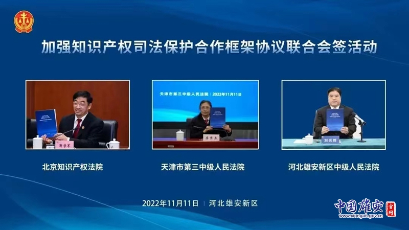 河北雄安新区中级人民法院与北京知识产权法院、天津市第三中级人民法院共同签署《加强知识产权司法保护合作框架协议》。中国雄安官网赵伟彤 摄