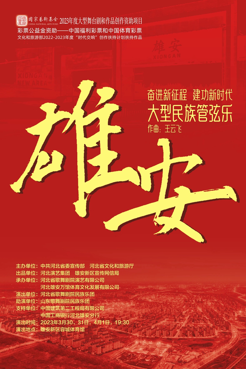 大型民族管弦乐《雄安》是国家艺术基金2023年度大型舞台剧和作品创作资助项目,同时也是文化和旅游部2022-2023年度“时代交响”创作扶持计划扶持作品。该作品由河北省委宣传部、河北省文化和旅游厅主办,河北演艺集团、雄安新区宣传网信局出品,河北省歌舞剧院演艺有限公司、河北雄安万馆体育文化发展有限公司承办,河北省歌舞剧院民族乐团、山东歌舞剧院民族乐团共同演出,旨在雄安新区设立六周年之际,用民族音乐形式,讲述雄安故事、奏响时代之音。