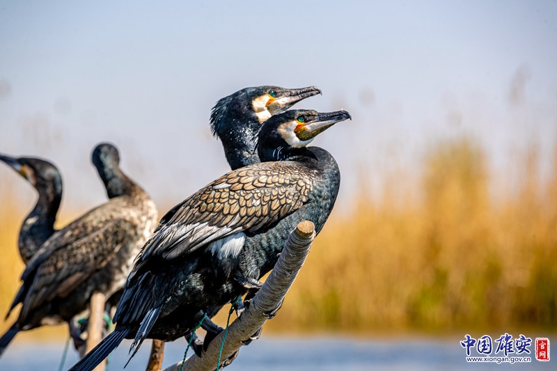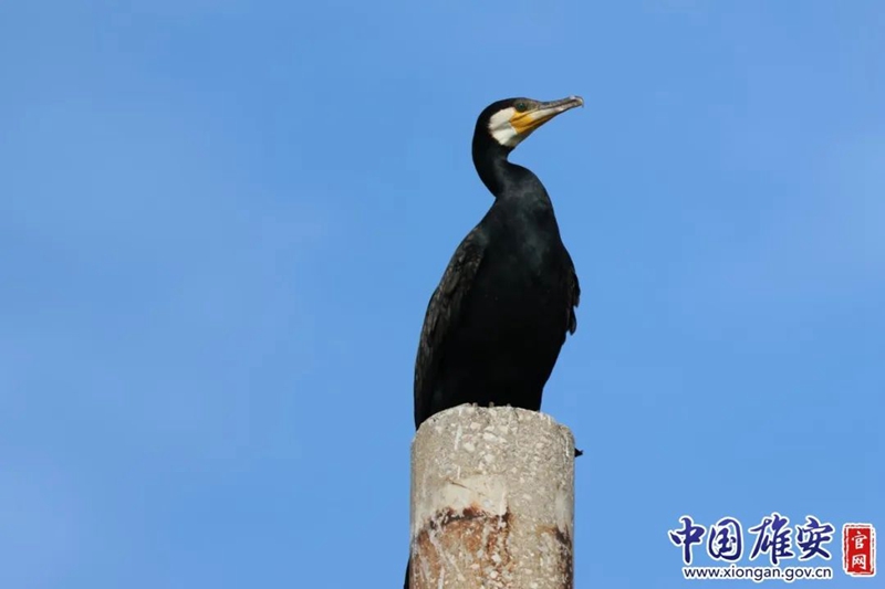 普通鸬鹚俗称“鱼鹰”“水老鸦”。体长约90厘米,嘴厚重,脸颊及喉白色,脸部有红色斑,两胁有白色斑块。中国雄安官网发