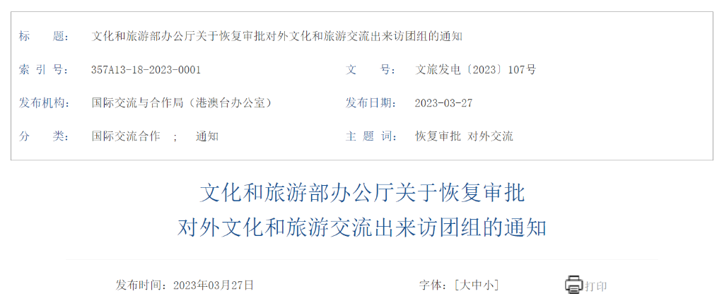 文化和旅游部办公厅3月27日发出通知决定,自4月1日起,各级文化和旅游行政部门可根据工作需要恢复审批对外文化和旅游交流出来访团组。