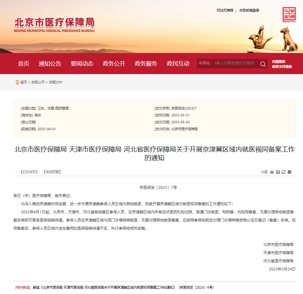 北京市医保局、天津市医保局、河北省医保局近日联合印发《关于开展京津冀区域内就医视同备案工作的通知》。详情如下: