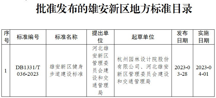 河北雄安新区管理委员会改革发展局会同河北雄安新区管理委员会建设和交通管理局联合发布了《雄安新区健身步道建设标准》1项雄安新区地方标准,现予以通告(详细目录见附件)。