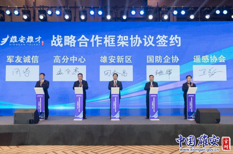 活动现场,雄安新区与中国国防工业企业协会、国家国防科工局重大专项工程中心、中国遥感应用协会、北京军友诚信检测认证有限公司签订战略合作框架协议;雄安新区改革发展局与西北工业大学航天学院、北京中科创星科技有限公司、成都必控科技有限责任公司、北京泰瑞通和节能环保科技有限公司、重庆推重比动力科技有限公司项目签订项目落地意向合作协议。
