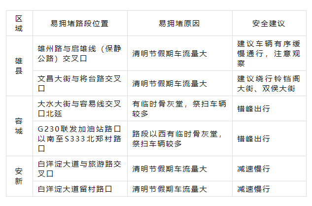 2023年清明节假期为4月5日,当天0时至24时高速公路实行免费通行。雄安新区公安局交通管理与巡特警支队对清明节期间道路交通态势进行分析研判,提醒出行群众合理选择出行时间和路线。清明假期前后,群众祭扫出行与近郊游、短途出行交织叠加,通往墓区景区的道路交通流量将大幅增加,交通事故风险加大,需要驾驶人特别注意。