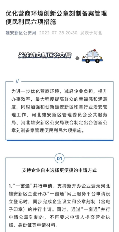 雄安公安始终坚持“人民至上”宗旨,让数据“多跑路”,让群众“少跑腿”。树立“靠前一步、主动作为”理念,大力整合公安窗口业务,推进公安政务服务事项“一站式办结”,将市级公安机关权限的治安、禁毒、网络安全管理等共52个公安政务服务事项受理窗口集中到雄安新区公安局人口与出入境服务大厅,实行“前台综合收件、后台分类审批、统一窗口出件”,进一步提高新区公安政务服务标准化、规范化、便利化水平,真正做到公安服务“一窗通办”。制定出台创新公章刻制备案管理便民利民6项措施,实现公章刻制备案全流程网上办理,压缩备案时长,实现企业开办一日办结,企业注销及时办理,以旅馆业等9个行业领域先行试点“证照联办”,推行网上并联审批,切实降低企业开办成本,减轻企业负担。加强监管体系建设,全面实行行政许可事项清单管理,扎实做好重点行业领域监管,着力打造公平公正的市场环境。一系列便民利企举措,传递出雄安公安优化营商环境的信心和决心,也赢得了人民群众信赖与支持。