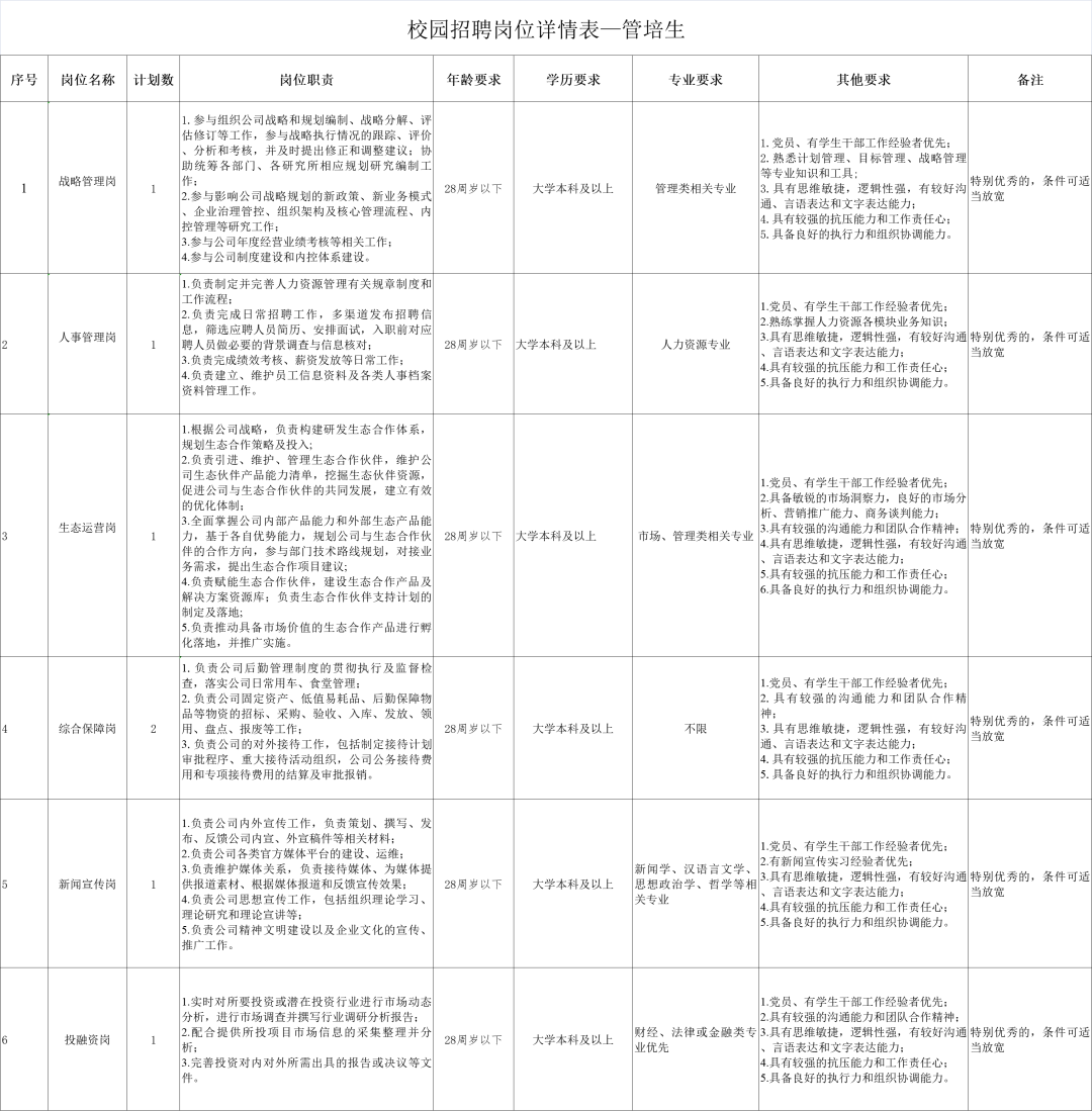 战略管理岗1人、人事管理岗1人、生态运营岗1人、综合事务岗2人、新闻宣传岗1人、投融资岗1人。