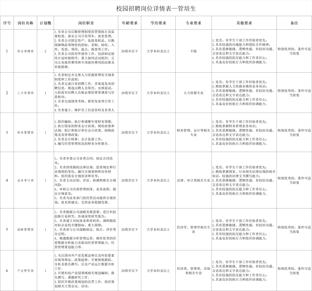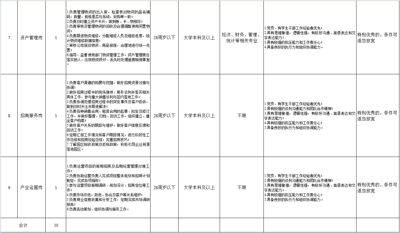 综合保障岗2人;人事管理岗1人;财务会计岗1人;法务审计岗1人;投资管理岗1人;产业研究岗1人;资产管理岗1人;招商服务岗1人;产业运营岗1人。