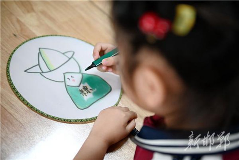 6月20日,邯山区第四幼儿园的小朋友在绘制作团扇,感受传统文化。