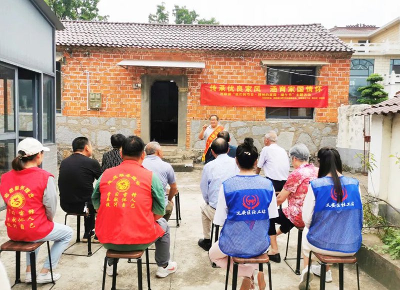 安徽省铜陵市义安区西联镇新时代文明实践所开展“传承优良家风 涵育家国情怀”端午节文明实践活动。“中国好人”汪世本在自家农家小院改造成的“乡野文化棚”外向村民讲诉优良家风故事,并和志愿者一起开展创作诗词等主题志愿服务活动,共同探寻端午文化魅力,激发大家的爱国情怀。