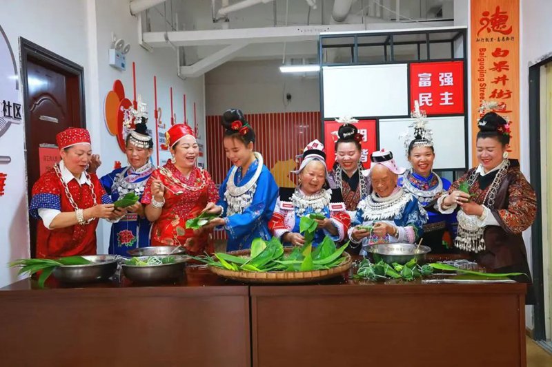 贵州省黔东南州凯里市白果井街道思源社区移民搬迁群众和志愿者来到新时代文明实践站,现场通过包粽子、话端午,共度佳节,营造了浓厚的节日氛围。