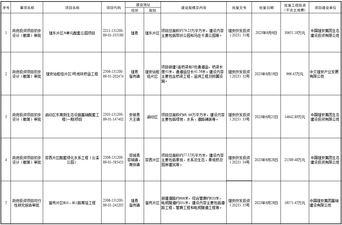 雄安新区政府投资项目审批结果公示(2023年6月份)
