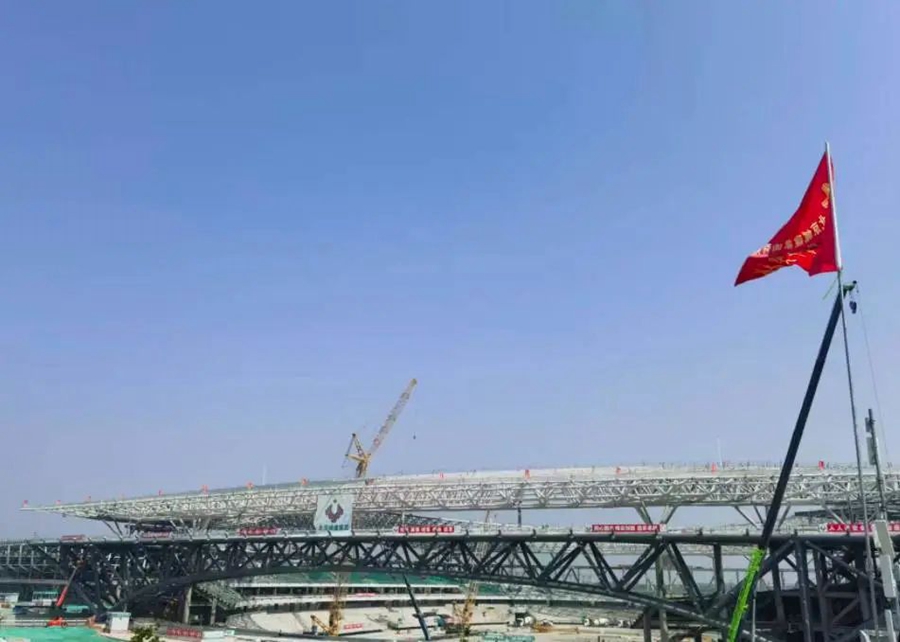 建筑采用“大跨度拱构架”“双首层设计”“减隔震”等新技术,具有先进的设计水准。截至今年6月初,体育中心一场两馆屋顶钢结构均已施工完成,游泳馆、体育馆二次结构、体育场地下部分二次结构已施工完成,已全面进入屋面、幕墙、机电安装施工,并逐步转入室内装修、室外小市政和景观施工阶段。