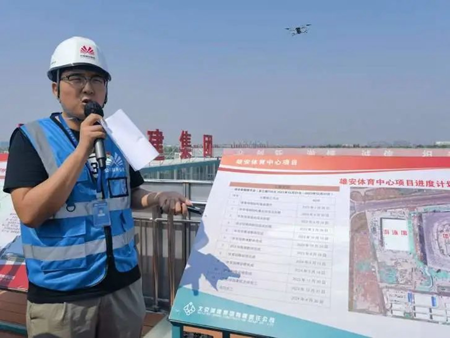 朱鼎祥向记者介绍雄安体育中心项目。雷崔捷 摄