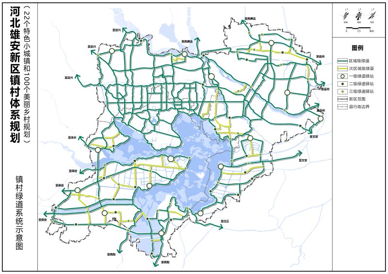 优化城乡路网体系,结合村庄规模、地形地貌、村庄形态、河流走向、对外交通布局及原有道路等,构建城乡全覆盖的道路网络,保障农村地区基本出行条件,鼓励发展镇村公交;构建乡村绿道网络,形成“环新区-环起步区-环白洋淀-环特色片区-环美丽乡村”的环线网络,构建区域级绿道、次区域级绿道和村级绿道三级绿道体系,结合美丽乡村配套三级绿道驿站。