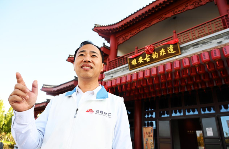 讲解员李志军在雄安郊野公园古韵非遗展馆前。刘光昱 摄
