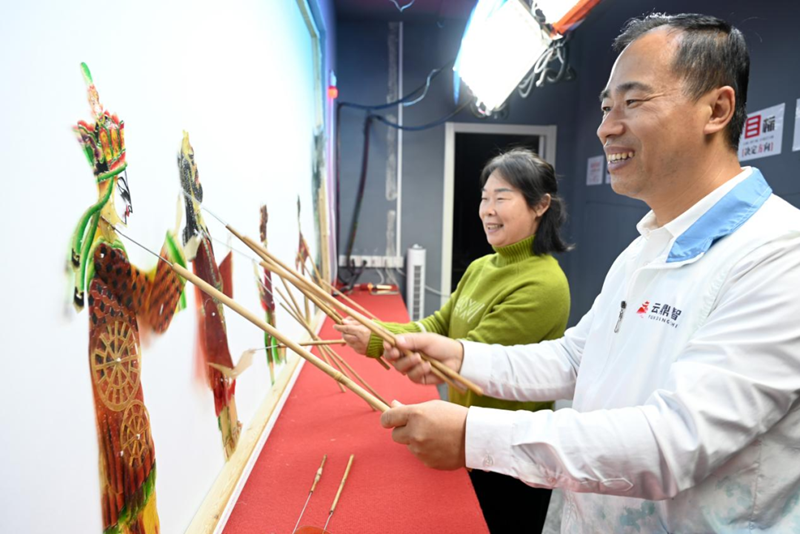 雄安郊野公园古韵非遗展馆讲解员李志军和游客一起体验皮影戏。刘光昱 摄
