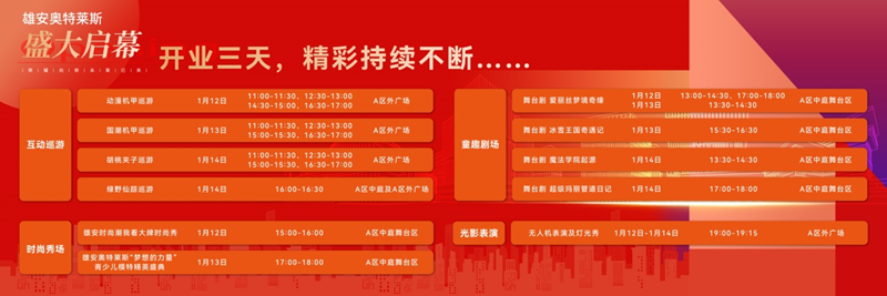 雄安奥特莱斯,开业即成焦点,多轮活动持续不断。精彩无人机表演、科幻灯光秀将点亮雄安新区夜空;主题表演国潮机甲巡游、新能源车展,为到场观众带来意想不到的惊喜。同时,还有赏心悦目的儿童模特比赛、时尚模特秀等节目轮番上演,让群众大饱眼福。