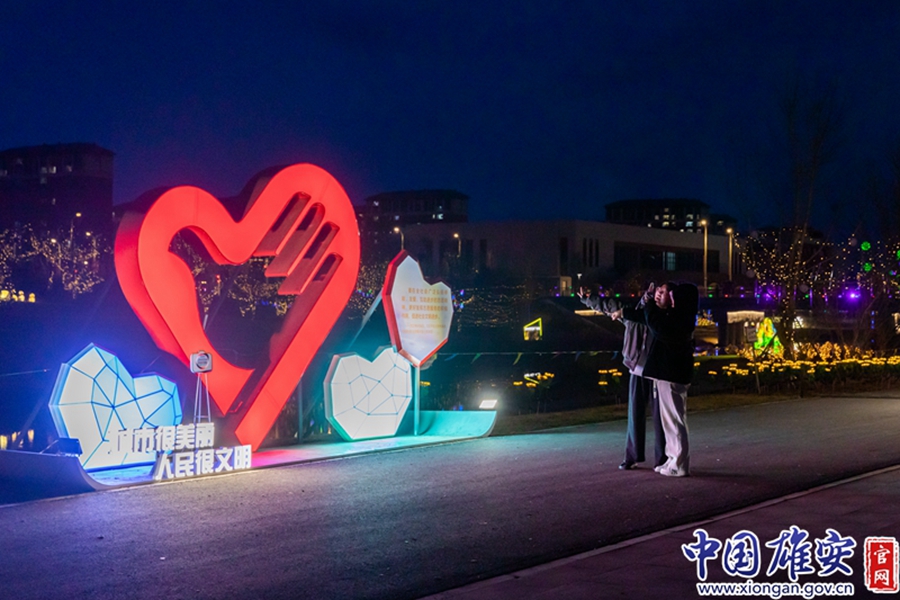 游客在龙泉河畔花灯景观前打卡拍照。中国雄安官网毛鹤然 摄