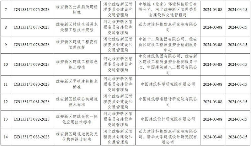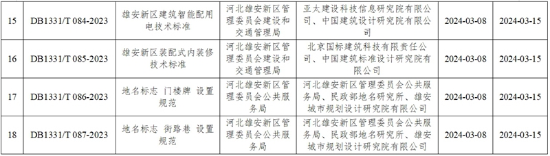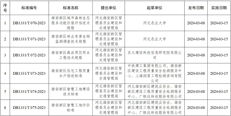 河北雄安新区管理委员会综合执法局会同河北雄安新区管理委员会建设和交通管理局联合发布了《雄安新区城市森林生态服务功能价值评估技术规程》等16项雄安新区地方标准,会同河北雄安新区管理委员会公共服务局联合发布了《地名标志 街路巷 设置规范》等2项雄安新区地方标准,现予以公告(详细目录见附件)。