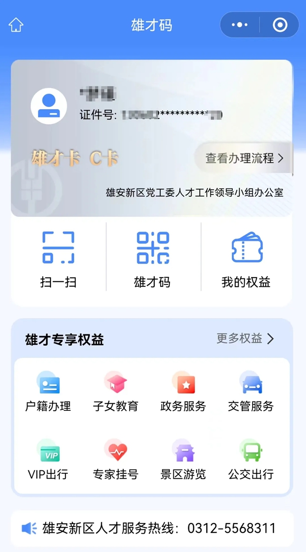雄才码小程序具备展示、扫码、权益列表等功能,搭载10余项专享权益,实现一码通行、一码通办。雄才卡持卡人可通过微信搜索“雄才码”小程序,实名认证登录后,在权益场景出示或扫一扫“雄才码”,无需实体卡,享受服务更便捷。雄安人才智慧服务平台集成各项人才服务,设置人才政策申报、求职招聘、新闻动态等6大模块,实现雄才卡、人才驿站、应届毕业生补贴等政策“一站式”申报。人才和用人单位可使用浏览器访问https://xatalent.cn/,注册登录后办理相关业务。