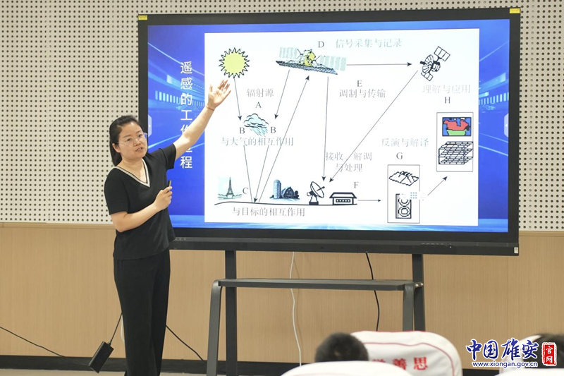 活动旨在利用科普资源助推“双减”,推进青少年素质教育和科学创新教育全面发展。活动中,学生共同观看了科普视频,初步了解了遥感知识。随后,雄安地质调查监测中心工程师孙立伟通过PPT向学生分享了遥感的原理和分类,并通过现场互动问答的方式,使学生了解地球的奥秘,探索卫星遥感技术及地质科学。