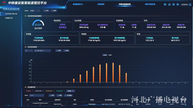 基础设施项目建设过程少则3年,多则7至8年,施工过程产生大量二氧化碳。中铁建设集团在雄忻高铁小里站项目试点应用中水系统、临建分布式光伏电站等创新做法。“我们应用自主开发的智慧能源管控平台对发电量、碳排放量进行监测,这里每天大概能生产1800至2500度绿电,相当于普通家庭一年的用电量。”中铁建设机电公司智慧机电产业研发中心总经理刘雪彪说,“经过测算,全年可减少碳排放量496.46吨,约等于标准煤260.14吨,种植树木2.7万棵。大约需要3年半就能实现设备投资‘回本’。”