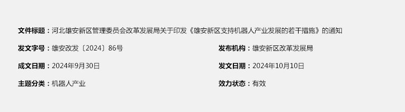 为贯彻落实《雄安新区机器人产业创新发展三年行动计划(2024-2026年)》,加快推动雄安新区机器人产业布局和发展,融入京津冀重点产业链条,打造成为新时代的创新高地和创业热土,参照《河北省支持机器人产业发展若干措施》等文件,提出以下措施。