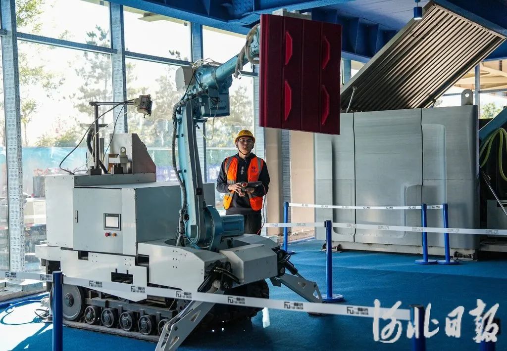 10月10日,在雄安新区容东片区的电建智汇城“雄安之翼”智汇实验室内,技术人员正在操作智能安装机器人抓取板材。河北日报记者李畅 摄