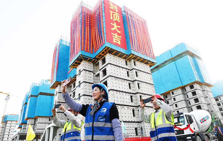 11月16日,雄安新区启动区滨水商业商务区中绿里项目举行主体结构封顶仪式。河北日报记者刘光昱 摄