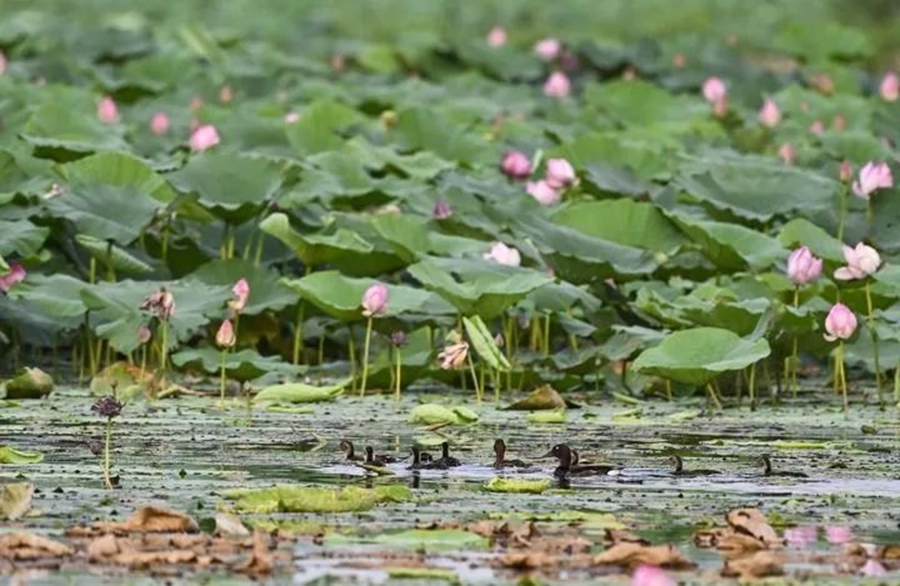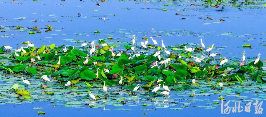 8月21日,白鹭在雄安新区白洋淀水域嬉戏。成群结队的白鹭与水面盛开的荷花,形成一幅自然和谐的动人画卷。张学农 摄