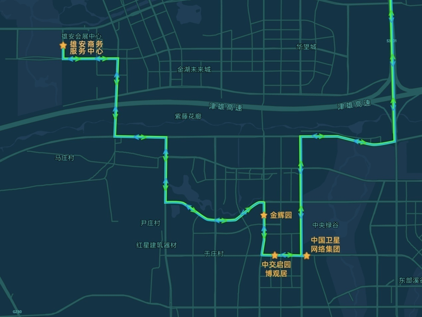 雄安地区设置4个上下客站点,从雄安商服中心站始发,途经博观居站、金辉园站、中国星网站。