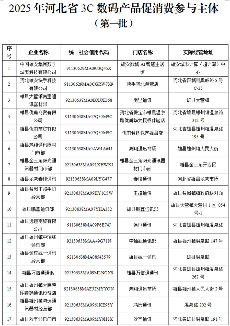 为贯彻落实河北省3C数码产品促消费活动有关工作,经企业自愿报名及资格审核,确定安新县科海电脑商贸有限公司等234家单位为第一批雄安新区3C数码产品促消费活动参与主体,现将参与主体名单予以公示,公示期3天(2024年12月30日至2025年1月1日)。