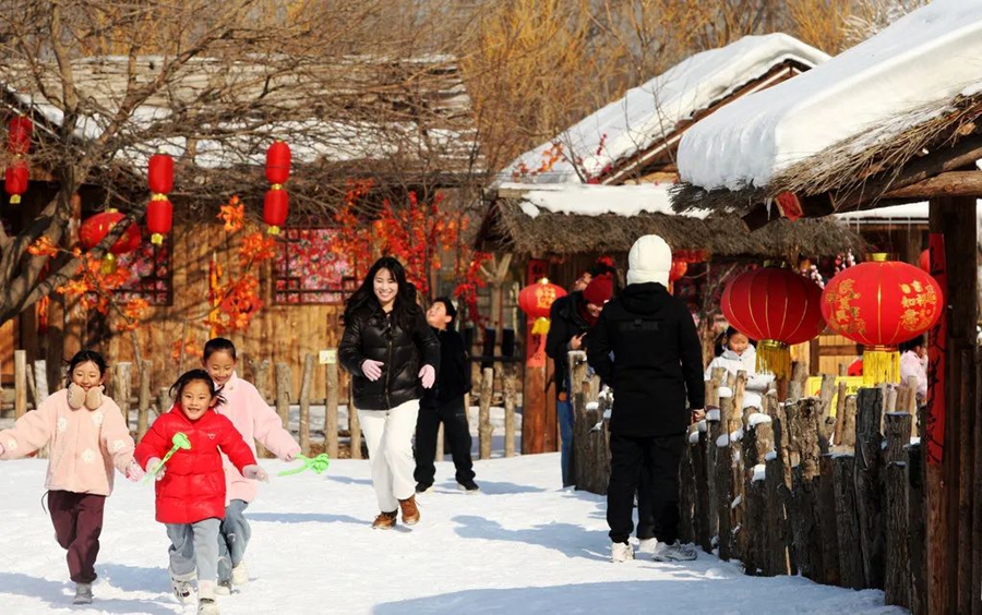 雄安郊野公园辛玛森林动物乐园中的“冰雪王国”内,本地市民张爽带着三个孩子一起在“雪乡”的东北小院前打卡拍照。而容城旅游达人“雄安小罗”则在一旁进行着现场直播:“庄稼院、篱笆墙、大红灯笼雪盖房,你看,雪乡‘搬’到了‘未来之城’,春节来雄安玩雪迎春约起来……”