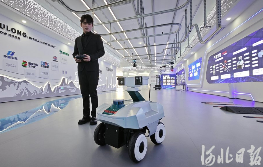 1月18日,雄安新区科创中心中试基地内,北京普龙科技有限公司销售部总经理童浩轩演示操作智能巡检机器人。河北日报记者曹铮 摄