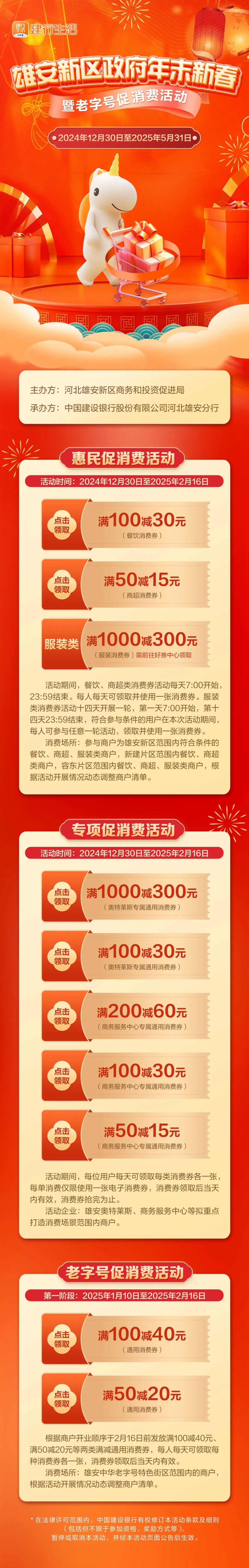 此外,春节促消费、雄安惠不停!雄安新区年末新春暨老字号促消费千万商超餐饮服装消费券持续发放中,快来参与吧!
