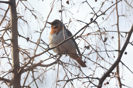赤颈鸫,雀形目鸫科,鸣禽,体长22至25cm。雄鸟上体灰褐色,眉纹红色,外侧尾羽红色;颏、喉和上胸部棕红色,其余下体白色;雌鸟似雄鸟,但红色部分较浅,胸前具黑斑。